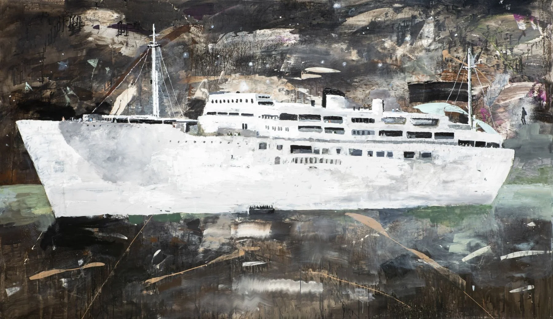 Ignacio Iturria, Barco de Inmigrantes, 2023, Acrylic on linen, 68.90h x 118.11w in