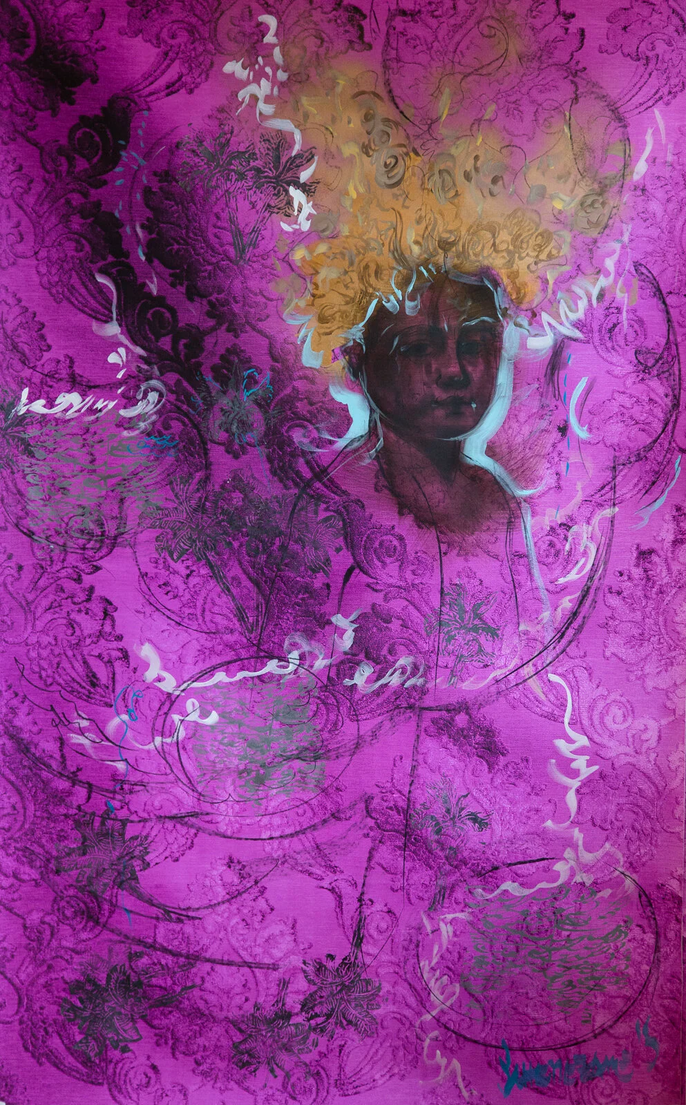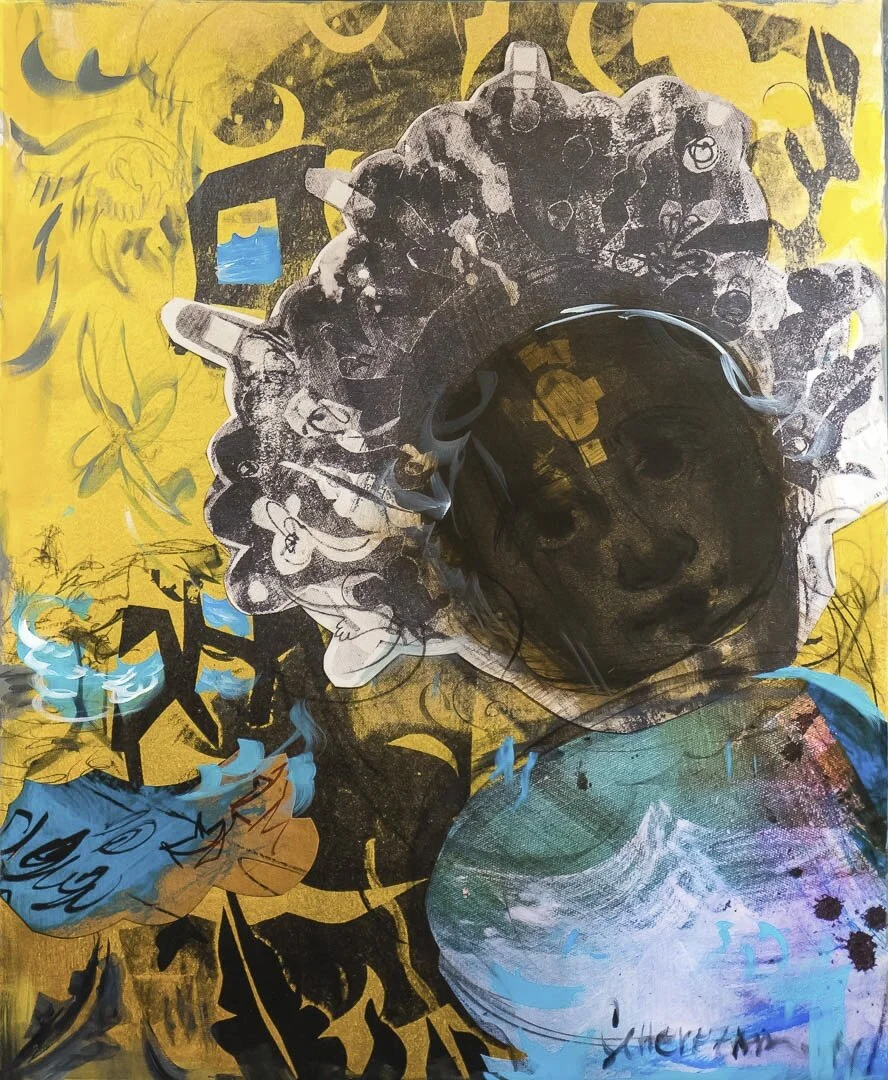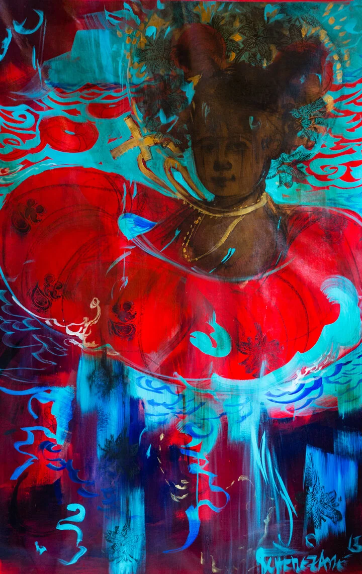 Teorias de Libertad: Virgen en mi Mundo Flotante, 2014, Mixed media: silkscreen, collage, inkjet, acrylic,carbon, ink on canvas, 44h x36w in