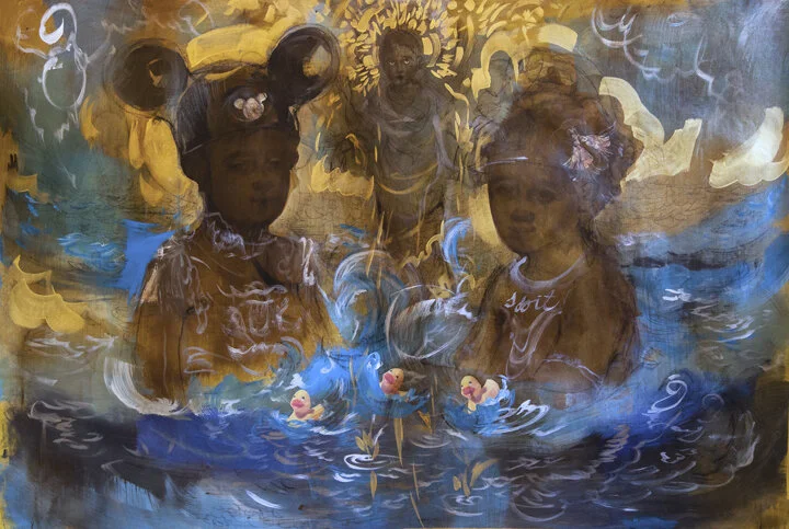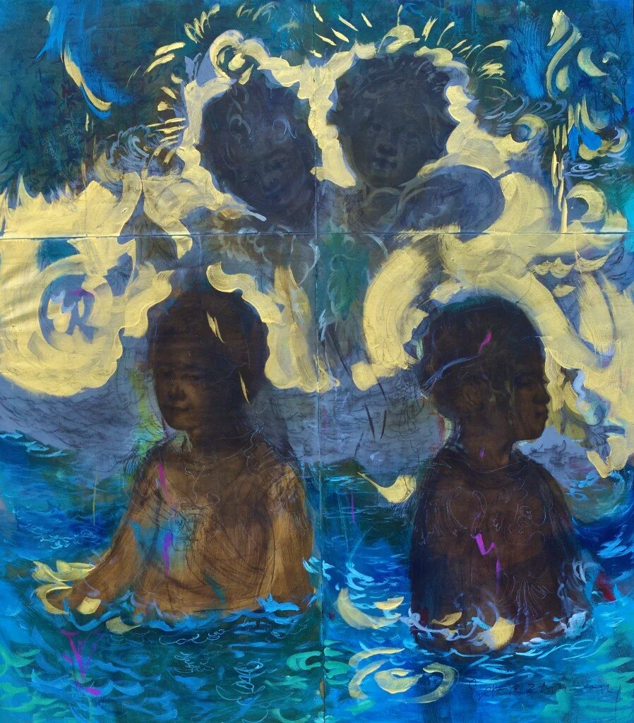 De isla a isla, 2015, Acrylic, pigments, charcoal, collage and ink on canvas, 72h x48w in Comisioned by The National Museum of Mexican Art in Chicago,