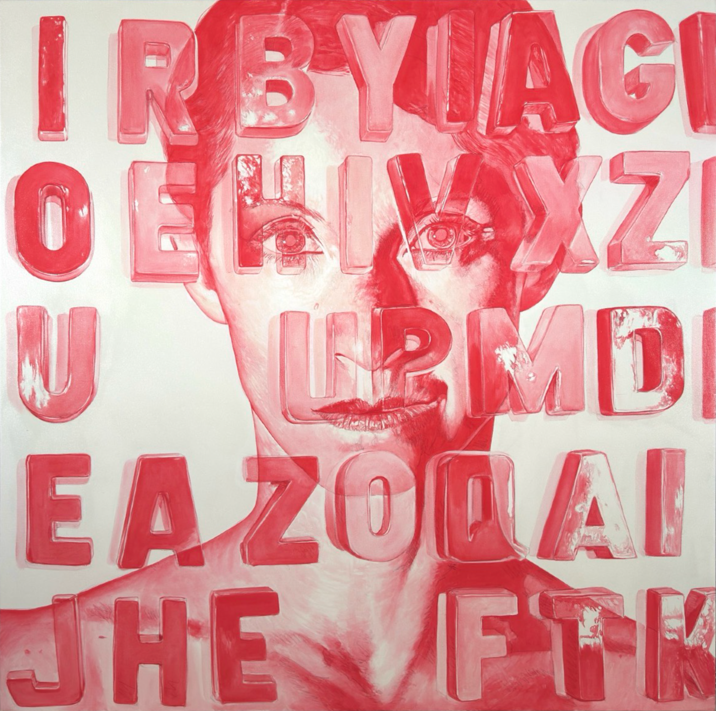 Pink Alphabet Nefertiti, 2025, acrylic on canvas, 68h x 68w in